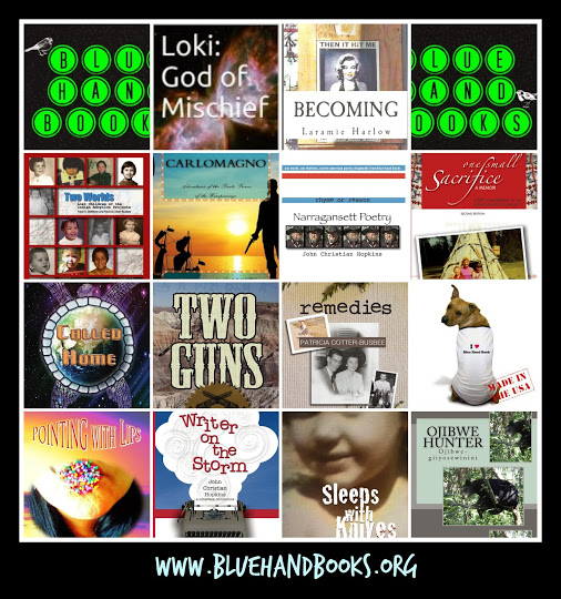 Tell us about Blue Hand Books:I started Blue Hand Books as a collective of Native American authors in 2011 to help my Narragansett friend John Christian Hopkins. He and I worked together at the Pequot Times in the early 2000s. John had tried publishing himself, and it worked fine but he needed more readers (and book sales). My husband and I were having brunch with John and his wife Sararesa in Connecticut that summer (2011) and out of nowhere—BOOM—I offered to help him publish his book Twilight of the Gods. He electronically sent me his files and somehow I formatted it and we published it! So the collective as a company officially kicked off on 11-11-11 when his book was published. It was more work than I imagined to layout a book but I've improved because of Pressbooks formatting software. (2023 - Pressbooks is no longer what we use.) As time went on, I needed to learn how to create e-books and tons of other stuff.